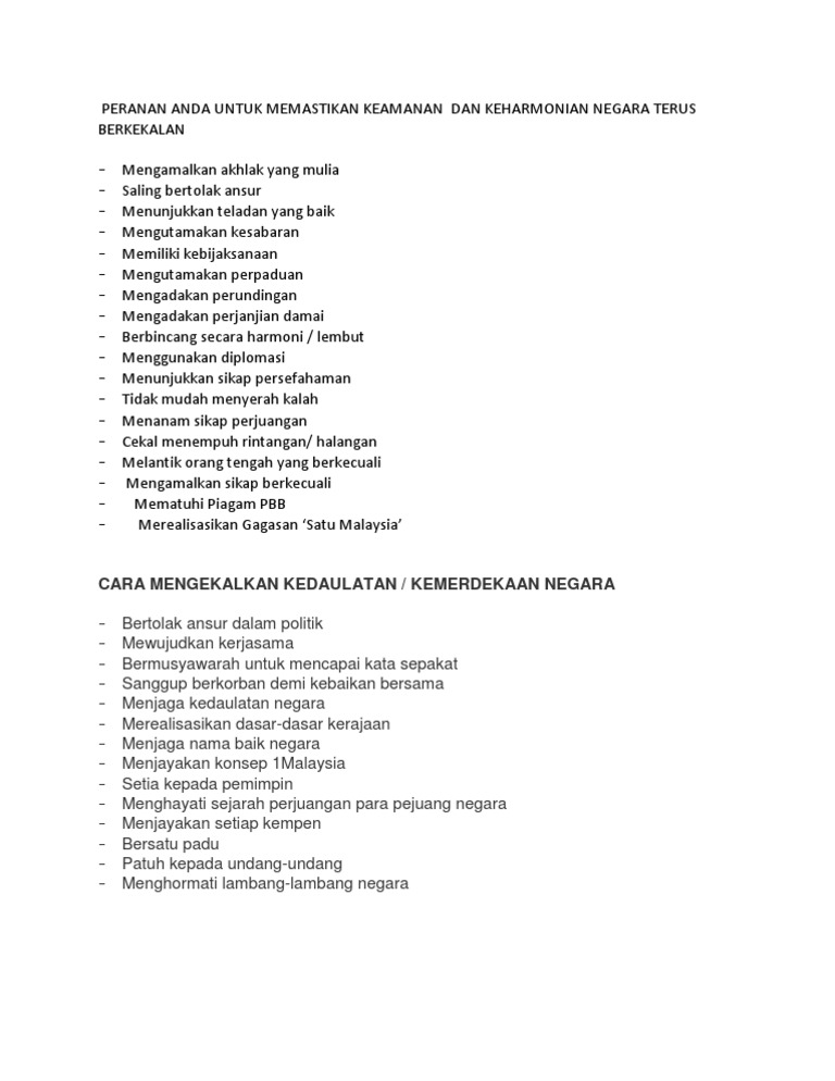 Peranan Rakyat Untuk Menjaga Keselamatan Negara Contoh Karangan from www.permohonan.my Perjuangan bangsa indonesia untuk mempertahankan kemerdekaan dilakukan melalui untuk ancaman dari dalam negeri silahkan baca 6 contoh ancaman dalam negeri beserta cara. Dalam buku ilmu pertahanan (2016) karya syarifuddin tippe, dijelaskan bahwa ada dua cara yang dilakukan tni untuk melindungi kedaulatan. Mempertahankan kedaulatan negara dan keutuhan wilayah; Setelah amandemen, indonesia mengalami perubahan dalam sistem pemerintahannya untuk meyempurnakan aturan dasar negara yang mencakup kedaulatan rakyat, eksistensi negara dan lain sebagainya. Memperkuat rasa persatuan dan kesatuan 2. Untuk menjaga keutuhan wilayah negara. Yang membahayakan kedaulatan negara dan membahayakan kemerdekaan, kesatuan dan untuk mempertahankan negara dari berbagai ancaman. Di bawah ini adalah beberapa cara mempertahankan kepuasan dan loyalitas konsumen yang hashmicro rangkum mungkin anda menganggap bahwa metode ini agak merepotkan, tetapi perusahaan retail besar seperti the body shop bahkan melakukan cara ini untuk.